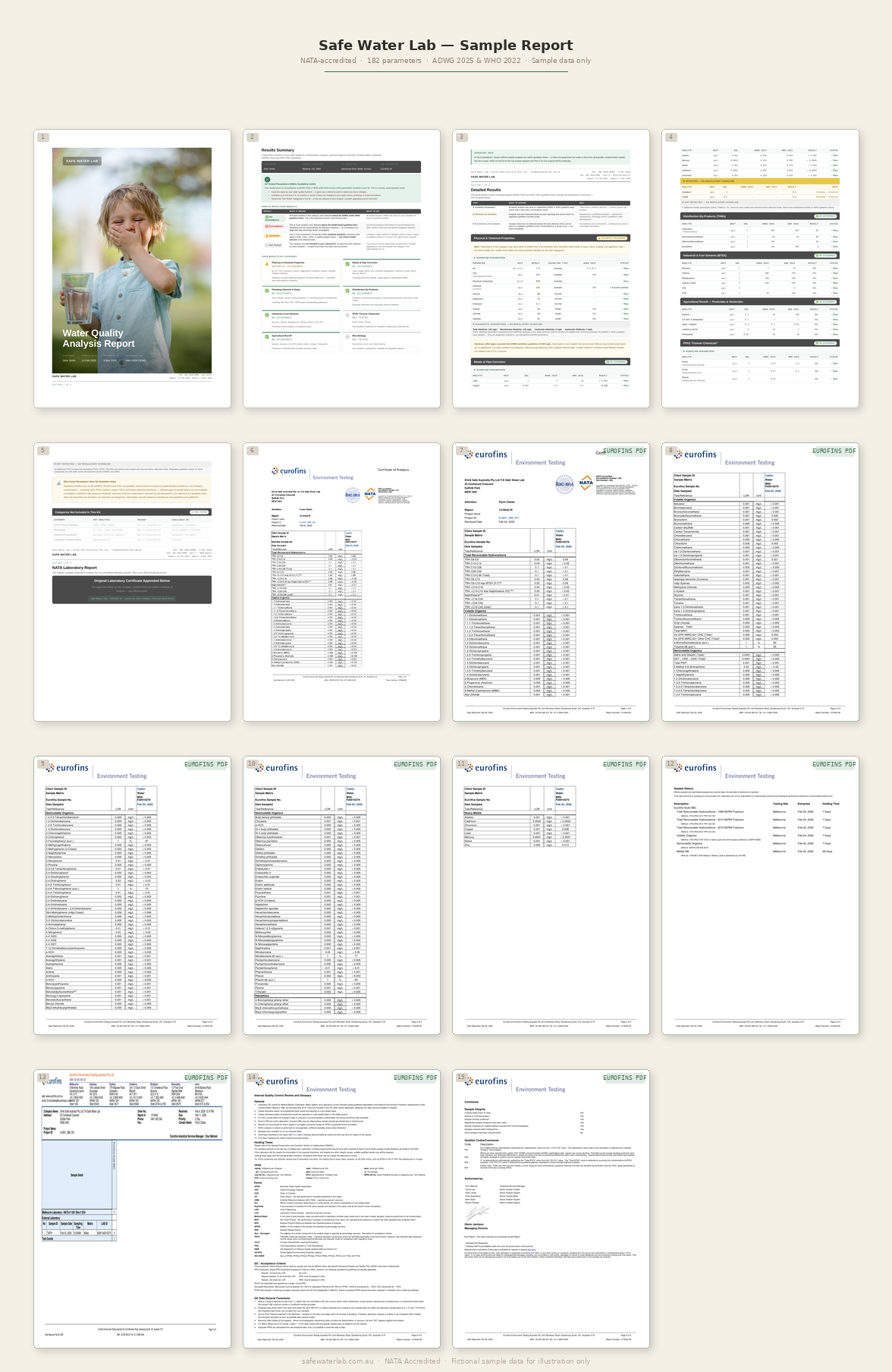 Your detailed Water Quality Analysis Report is delivered as a digital PDF — plain-English results benchmarked against Australian drinking water guidelines, with the original NATA-accredited Certificate of Analysis included.